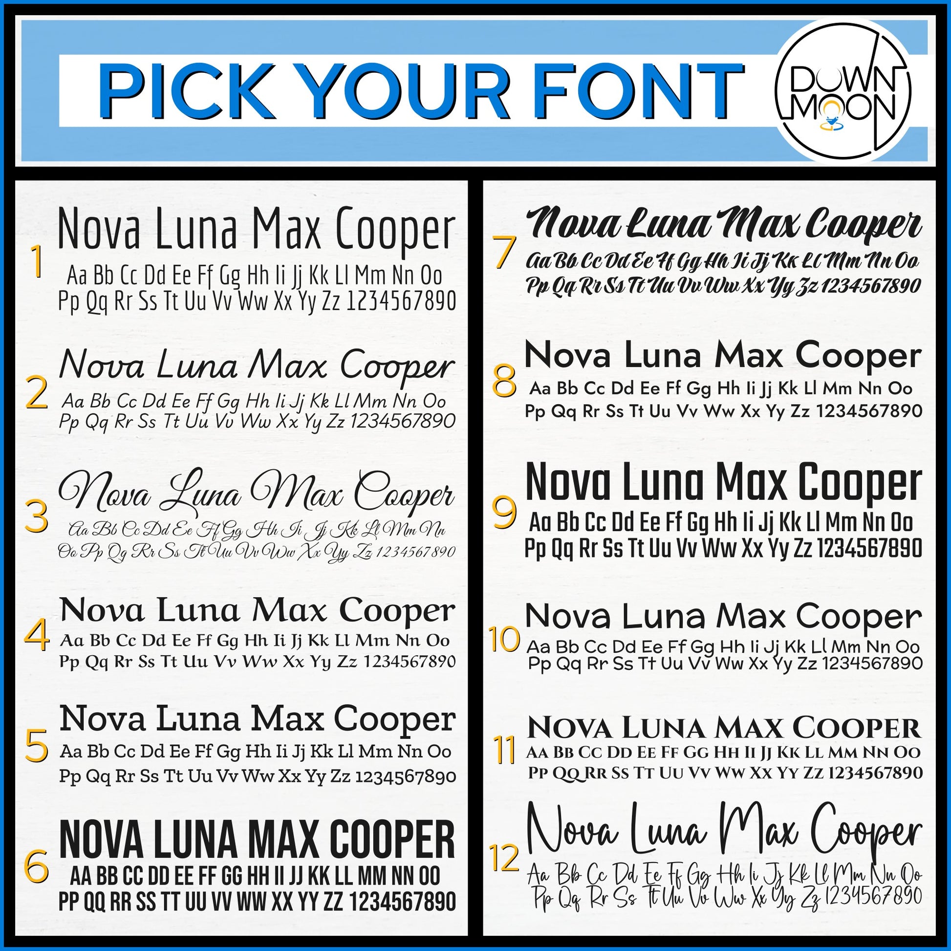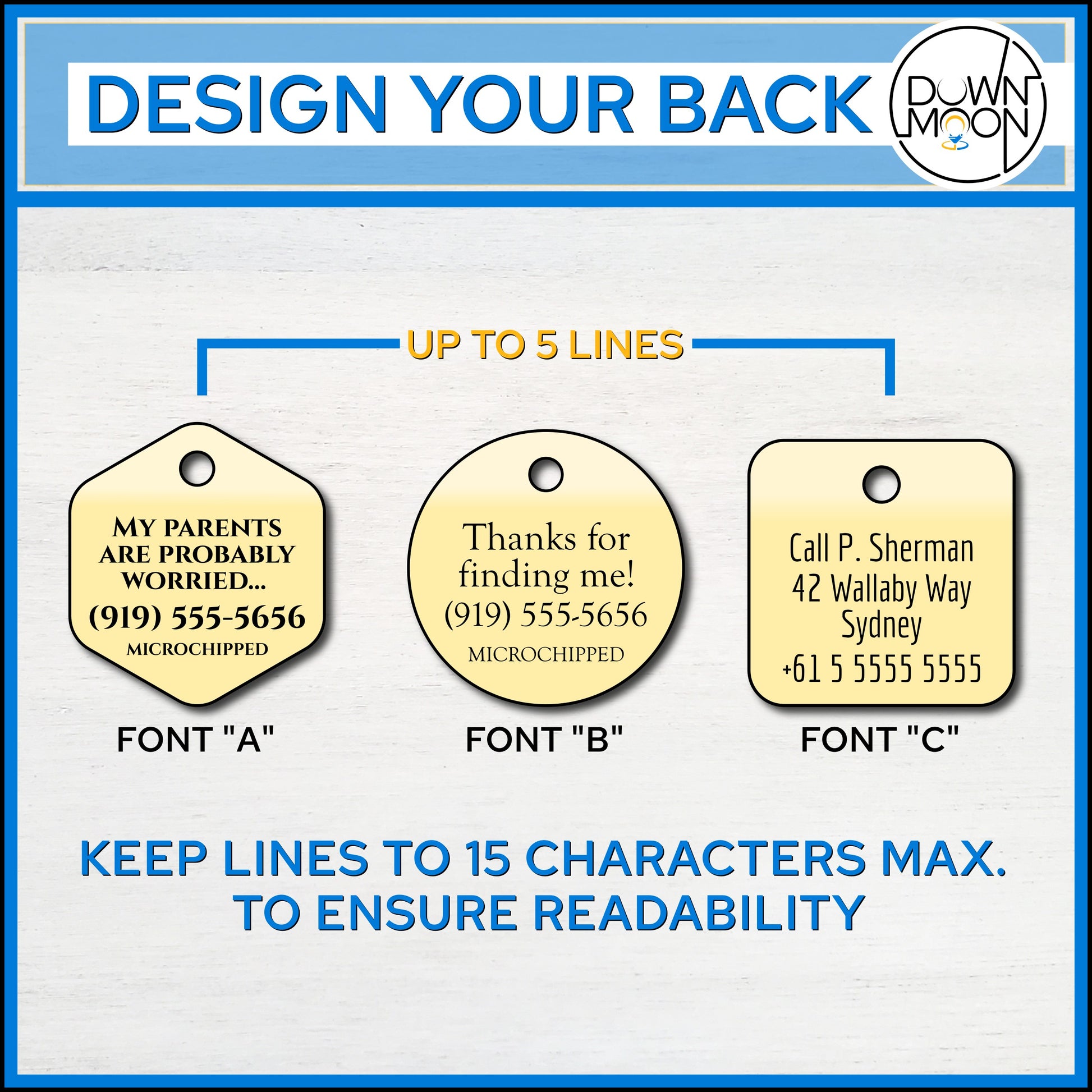 Choose from 3 font types (A, B, or C) *See pics*. Add a short saying and contact info to make your tag personal and useful! The back is bevelled