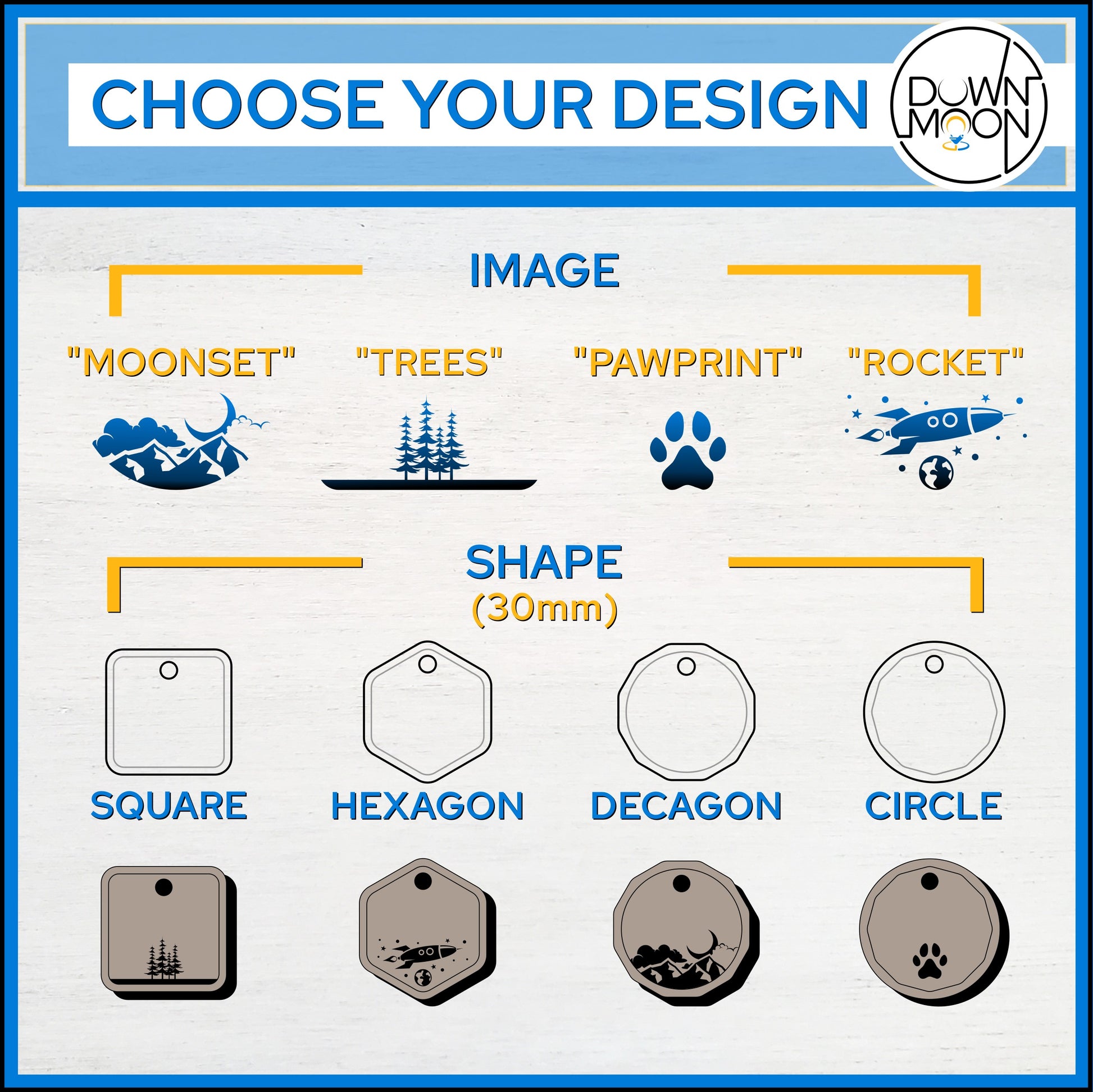 Down Moon's wood pet tags are made of 1/4" (6mm) thick solid walnut or solid curly maple. These tags are then engraved with extreme precision to create a high-contrast and easy to read tag that your pet will love.