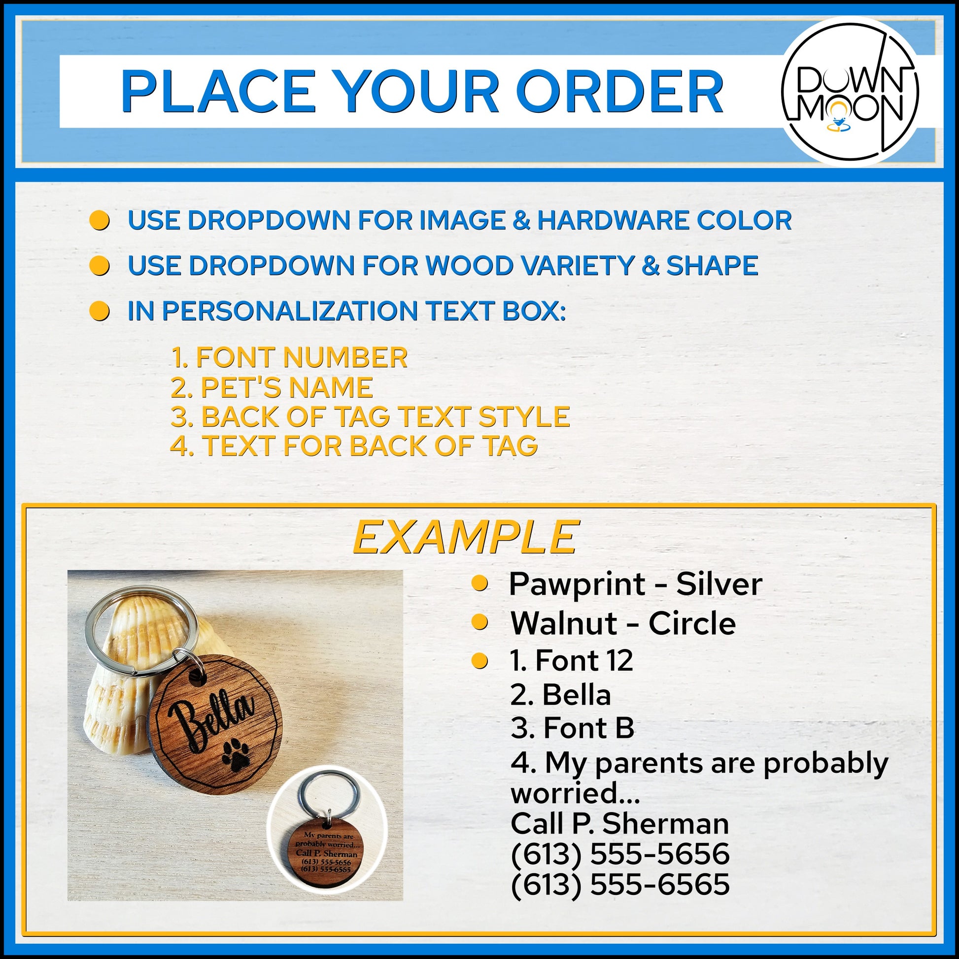 Choose from 4 original design options, wood variety, size, and font and I'll custom-fit your pet's name to make your tag look the best it possibly can