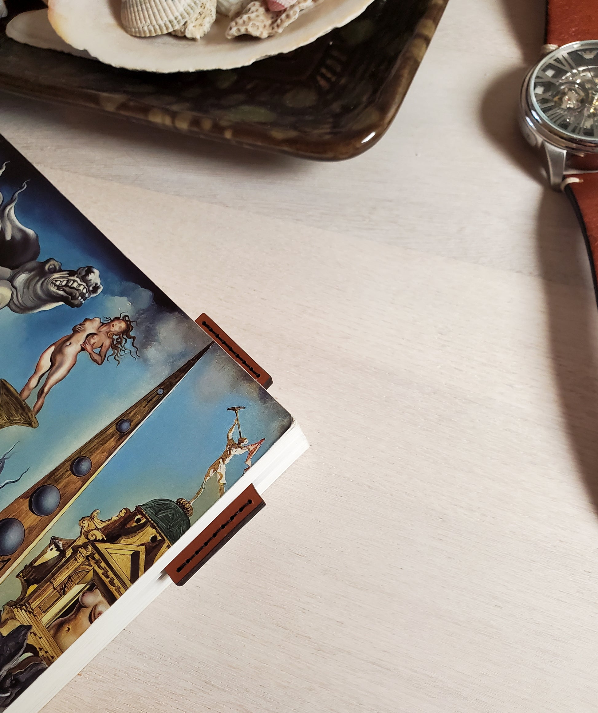 Made from durable and natural veg-tanned leather, this corner-of-the-page bookmark is laser-cut, hand-painted and handstitched by my very own digits.