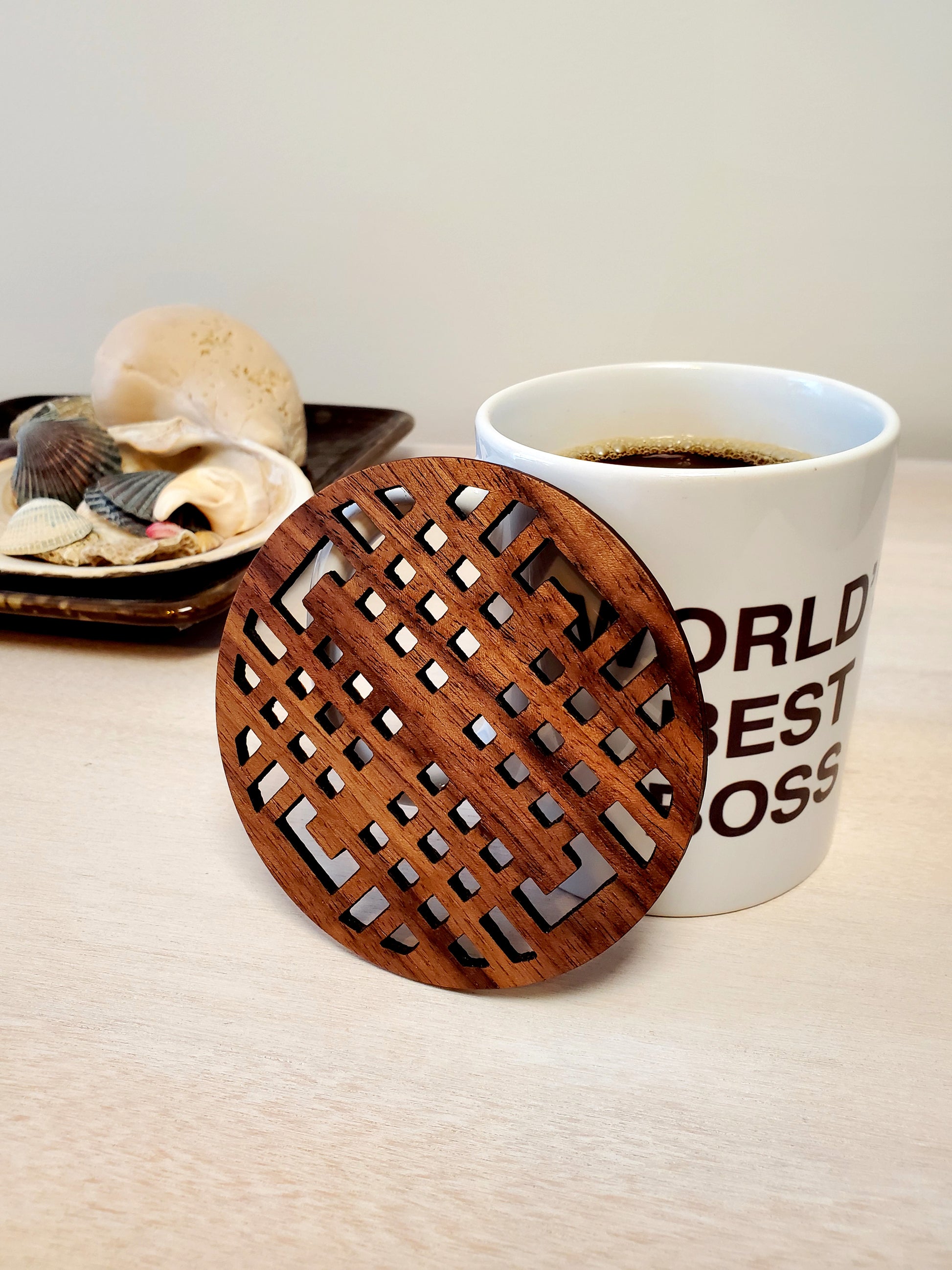 These standard-size round coasters are designed in-house and come in a variety of styles to choose from.
